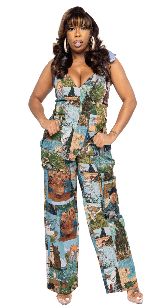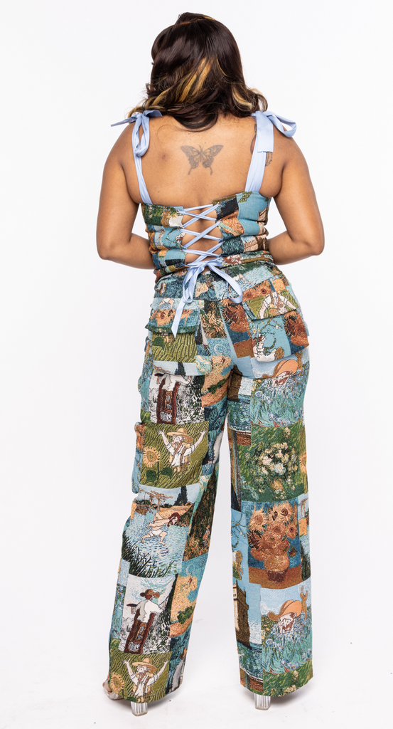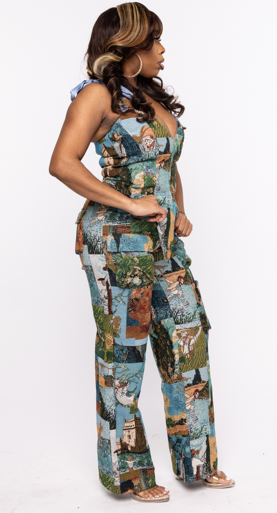 Get ready to rock this two piece tapestry set! Featuring a bustier top and matching cargo pants in a unique brown tone, this set will make you stand out from the crowd. Perfect for those who want to add some edge to their wardrobe. Are you ready to slay in style?