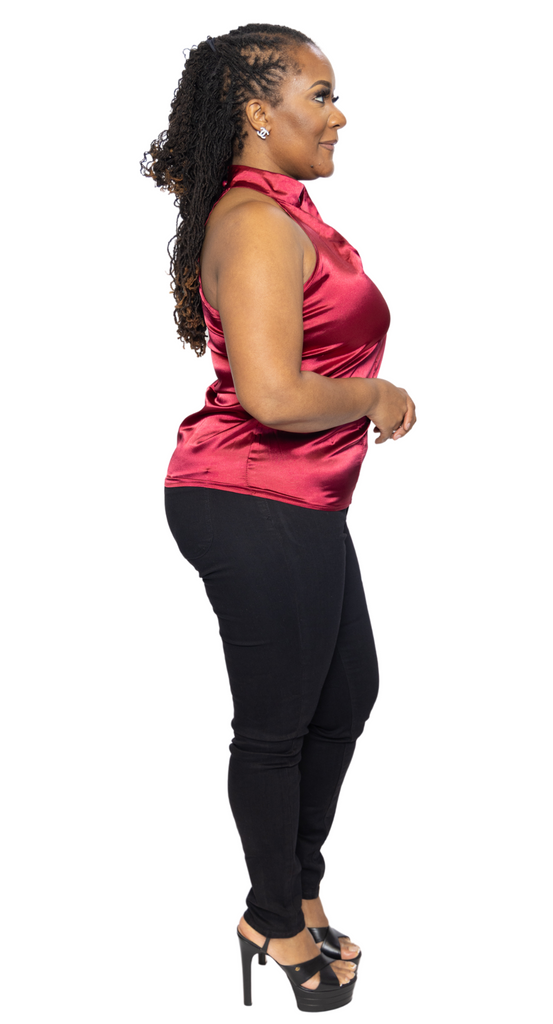 Flaunt your style with our elegant satin top! The halter neck design is perfect for every silhouette, while the stylish burgundy color complements any suit. This top will surely elevate your look with its flattering fit. Upgrade your wardrobe today!