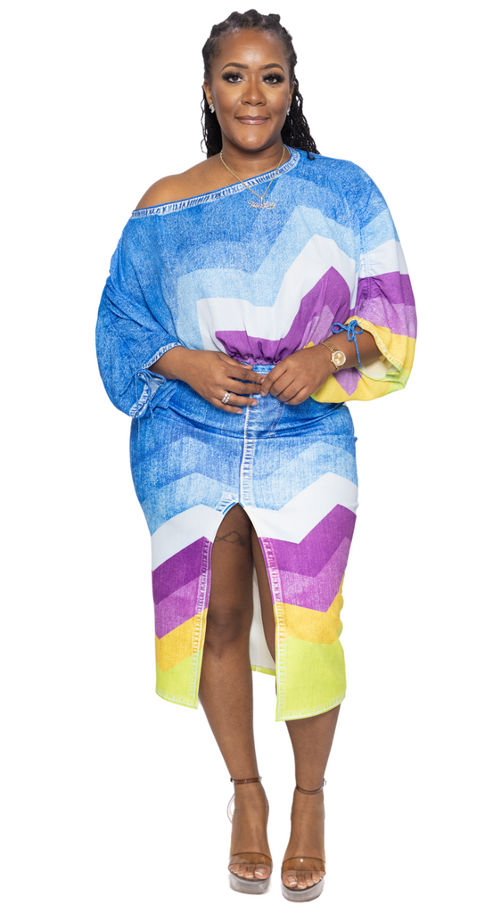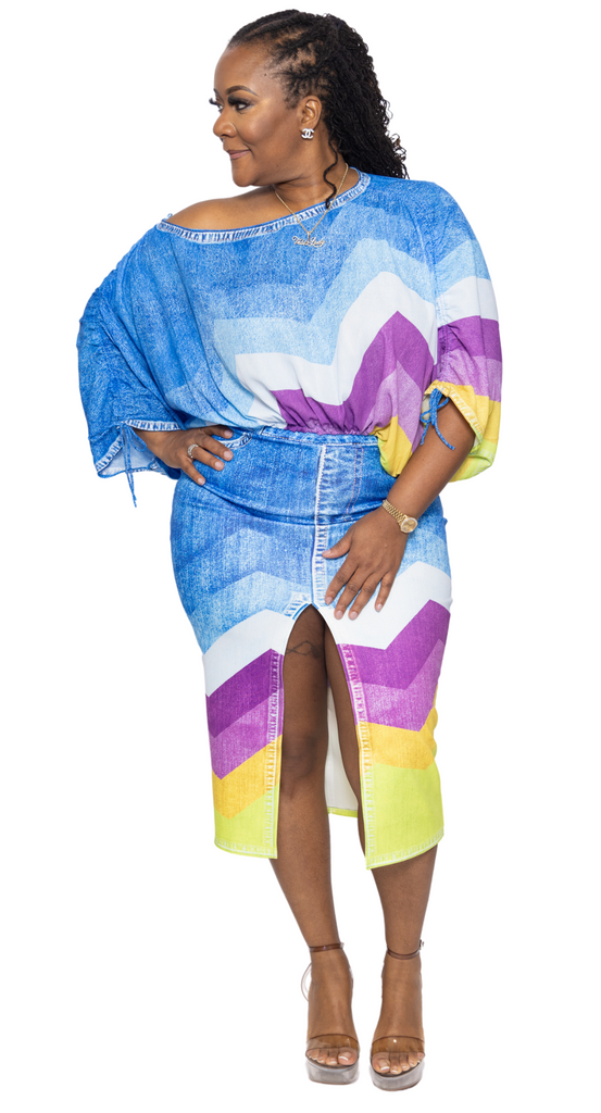 Ride the wave of fashion with our Wave Set! This two piece matching set features an off-shoulder top and a front-split skirt, both adorned with a playful wave pattern in multi colors. Stand out in style with this unique outfit.